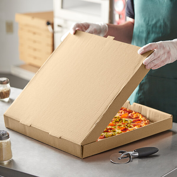 This 18" x 18" pizza box features a durable B-flute corrugated construction, so you can trust that your box won't warp and your pizza will stay hot. This kraft corrugated plain pizza / bakery box is a perfect addition to your restaurant or bakery!