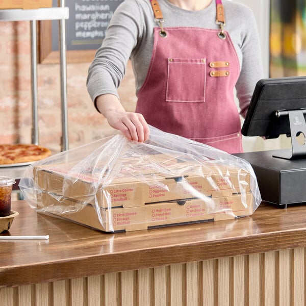 Constructed from 1.75 mil high-density polyethylene, this bag is tear-resistant, providing reliable support for your food items during transportation. The sturdy material ensures that your customers receive their orders intact and secure, maintaining the quality of your dishes. Whether you're running a pizzeria, deli, or catering business, this plastic catering tray bag is an essential tool for streamlining your delivery and takeout operations. Upgrade your packaging solutions with this reliable and efficient choice to meet the demands of your busy establishment!