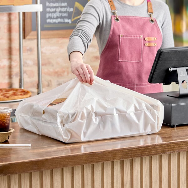 Constructed from 1.75 mil high-density polyethylene, this bag is tear-resistant, providing reliable support for your food items during transportation. The sturdy material ensures that your customers receive their orders intact and secure, maintaining the quality of your dishes. Whether you're running a pizzeria, deli, or catering business, this plastic catering tray bag is an essential tool for streamlining your delivery and takeout operations. Upgrade your packaging solutions with this reliable and efficient choice to meet the demands of your busy establishment!