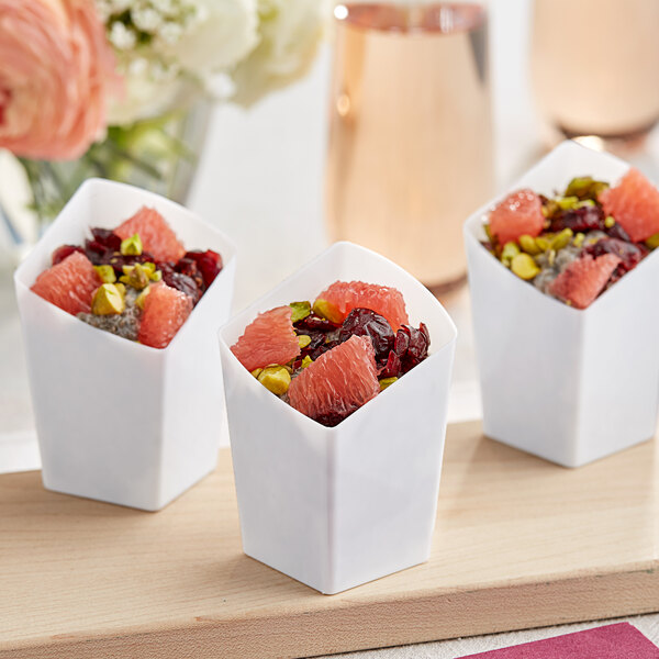 The simple white construction of these mini appetizer cups allows for effortless showcasing of your culinary creativity. Servers will be able to quickly and easily identify contents, and guests will love the eye-catching delivery of your featured appetizers, samples, or desserts. Designing and creating products with the cost-efficient consumer in mind, Visions provides high-quality items for a low, economical price, and this product is no exception. Serve your guests in style with Visions tiny appetizer cups!