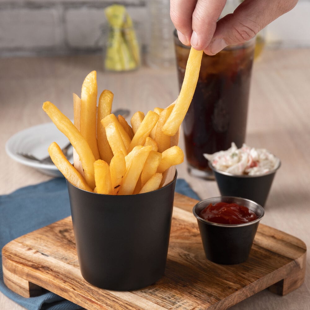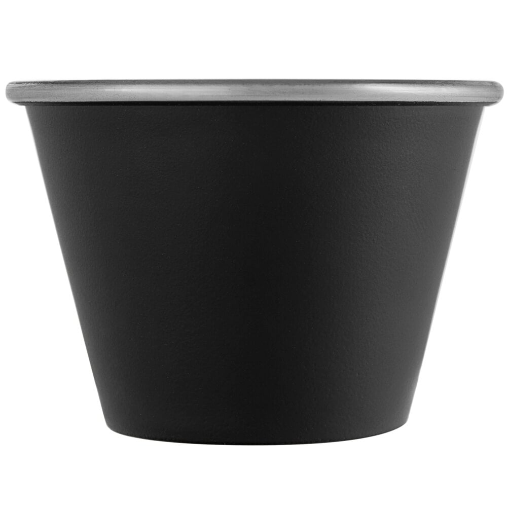 This sauce cup features a black powder-coated matte finish which provides a classy, sophisticated look that is perfect for complementing your trendy display. The matte black coloring is a nice, subtle upgrade from your typical stainless steel cups. Plus, the 2.5 oz. size is excellent for portion control and reducing waste in your dining room so you can use it for the perfect single serving of any sauce or dressing.