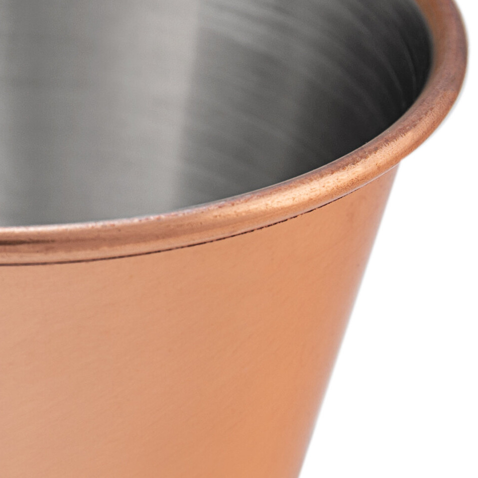 This sauce cup features a copper-plated exterior with a stainless steel interior that adds a classy, sophisticated look to your presentation. The copper design is a nice, subtle upgrade from your typical stainless steel cups. Plus, the 2.5 oz. size is excellent for portion control and reducing waste in your dining room so you can use it for the perfect single serving of any sauce or dressing.