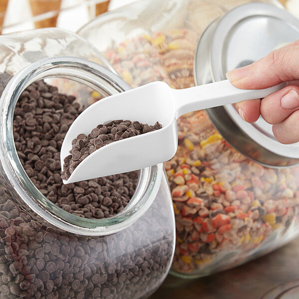 This basic white polypropylene plastic scoop is great for smaller bins of rice/beans/flour, offering a 6oz size. It would likely also be ideal for candy shops or markets where you might want the scoop hanging rather than inside the bin or dispenser, and the flat bottom means it'll hang up nicely. Good product, great price.