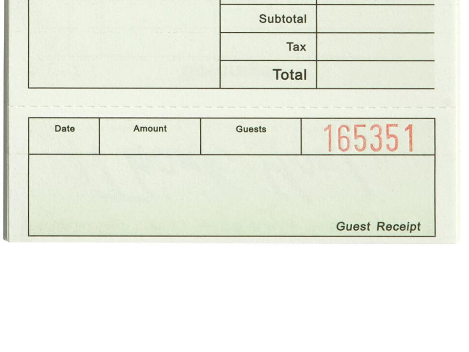 A perforated numbered stub at the bottom of the duplicate check serves as a receipt for guests or for accounting purposes for your establishment.