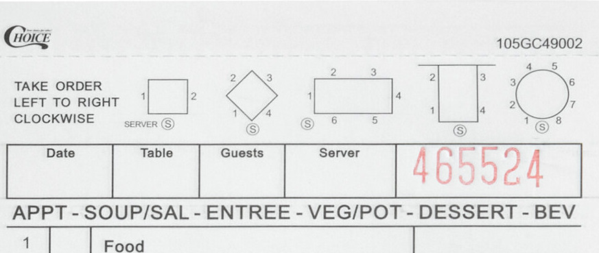 Table diagrams at the top of each guest check further enhance order accuracy by assigning each patron a placement at the table. There are also spaces underneath to record the date and server.