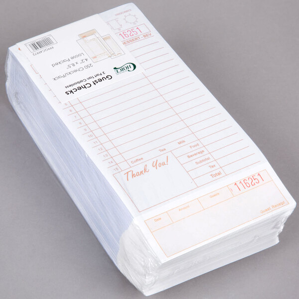 Featuring a tan print on crisp, white paper for easy readability, this Choice 2 part guest check will help to increase productivity in your restaurant or diner! It gives your staff the tools that are necessary for them to collect and bill orders quickly and accurately. Plus, the check has pleasant parting phrases on it to let guests know that you appreciate their business.