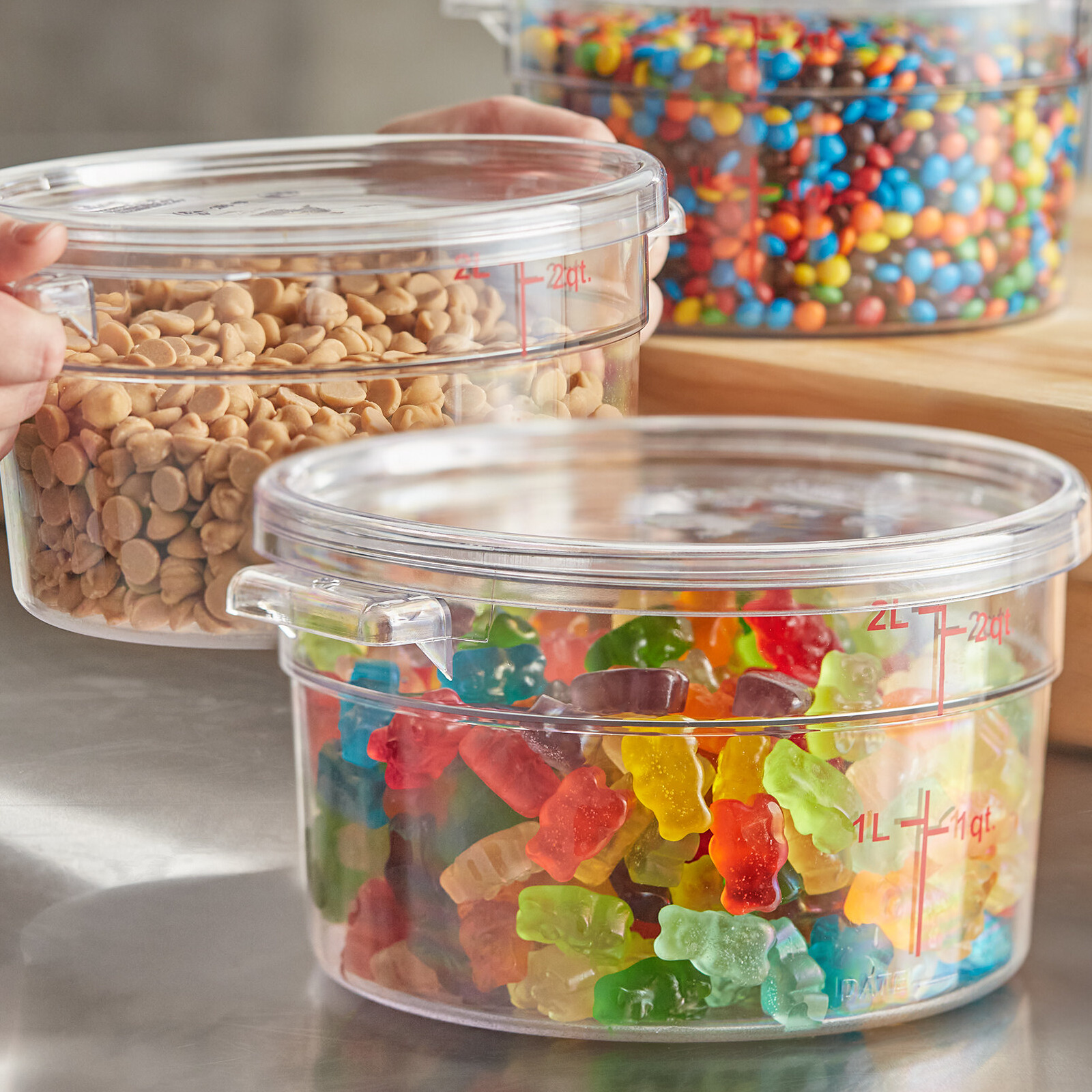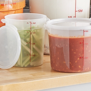 The crystal-clear design takes the guess work out of trying to identify what food product is stored inside. Bold red graduations are printed on the side of the container in both quarts and liters for easy, immediate measuring. This food storage container's round shape means it maximizes airflow in and around the product. Easily identify and track the date your food product was made using the reusable "date" indicator at the bottom of the container or simply adhere a label to the side of your container.