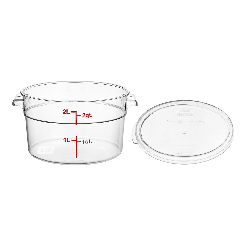 With a completely clear construction and versatile 2 qt. capacity, this container and lid make it easy to store ingredients, as well as fully prepared food. The lid keeps food fresher for longer than when covered with traditional foil or plastic wrap. This food storage container and lid are perfect for restaurants, caterers, delis, and cafes. Use them to store freshly-chopped fruit salad, sliced vegetables, soup stock, or stew.