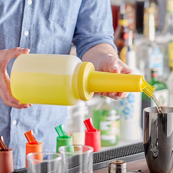 This system offers you an economical solution for efficient storing and pouring whether your employees are making drinks at the bar or pouring batters and oils in back-of-the-house applications. This bottle, cap, and spout are easy to clean and color-coordinated for quick product identification. Thanks to the stackable design of the lids, this system makes it easy to store backup containers of product for your busiest time of the day!