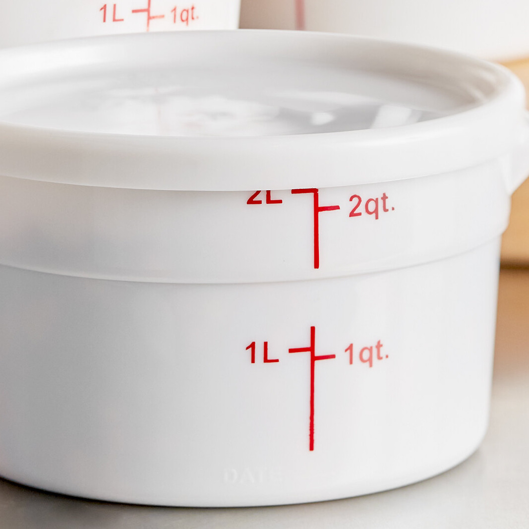 The white design of this food storage container allows for a clean look. Bold red graduations are printed on the side of the container in both quarts and liters for easy, immediate measuring, saving you time and effort during food preparation.