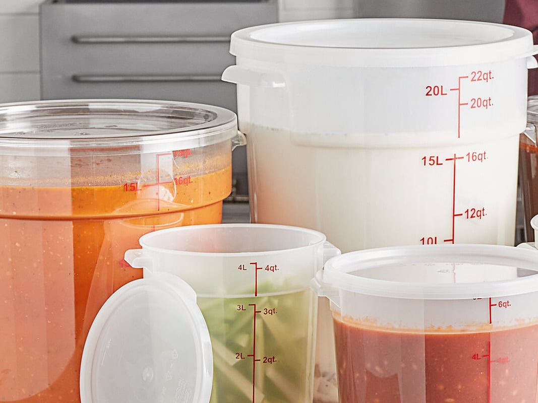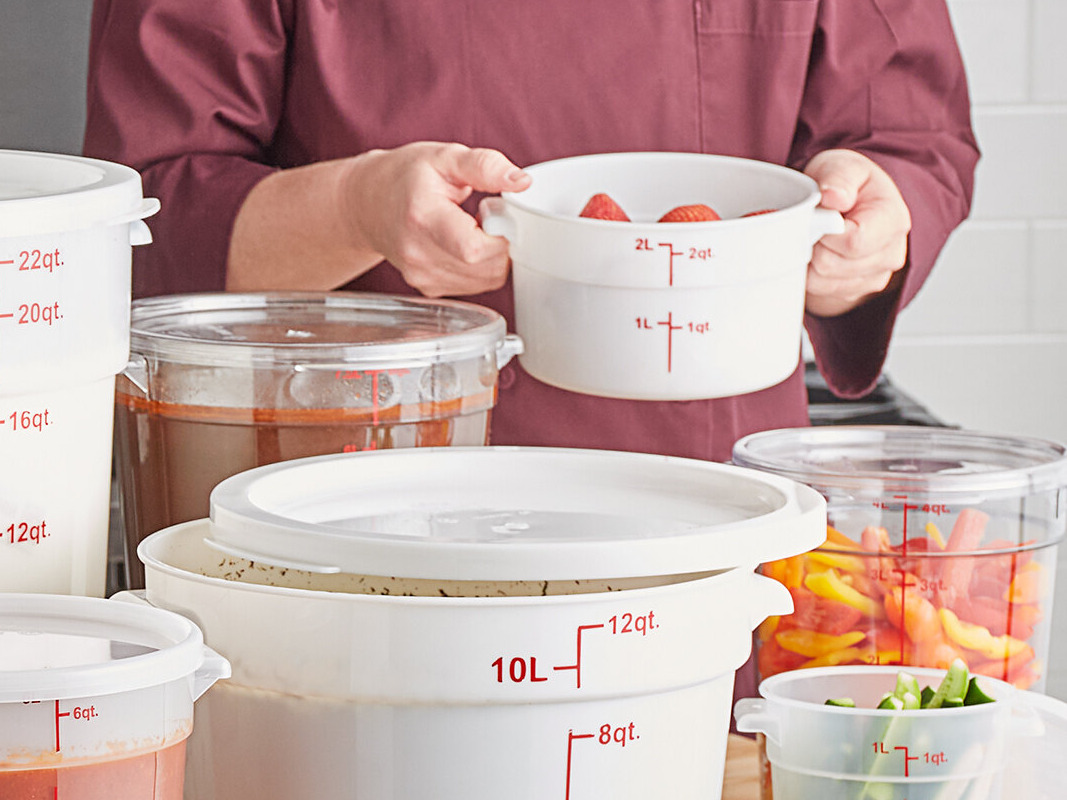 Whether storing dry goods or prepped ingredients, this container is versatile and can handle temperatures ranging from -40 to 160 degrees Fahrenheit, making it ideal for a wide range of kitchen tasks. This Choice white round polypropylene food storage container with lid is perfect for restaurants, catering establishments, delis, and cafes that want to enhance their service and streamline their prep organization!
