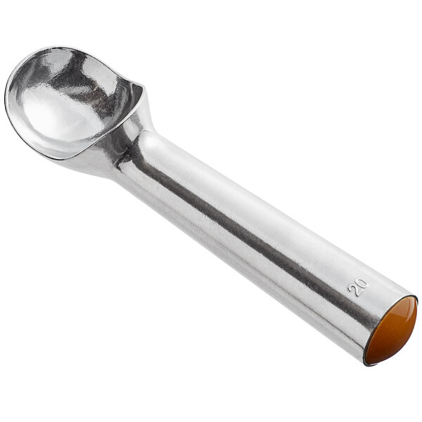 This #20 ice cream scoop features a gold color-coded cap for quick and easy size identification. Holding approximately 2 oz., this dipper is the perfect size for portioning out scoops to create a single serving or for dipping into multiple flavors to fill one cone. Suitable for both right- and left-handed users, serving dessert has never been easier, faster, or more convenient!