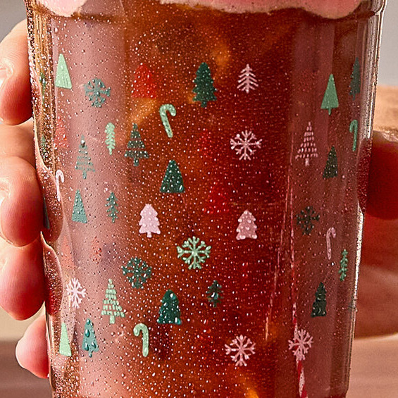 The crystal-clear PET plastic construction combined with the fun holiday-themed design gives this disposable cup an upscale appearance while providing excellent clarity. Plus, the simple, modern icons provide a colorful, unique presentation. The increased product visibility and engaging seasonal design help boost impulse sales for all of your thirst-quenching beverages.