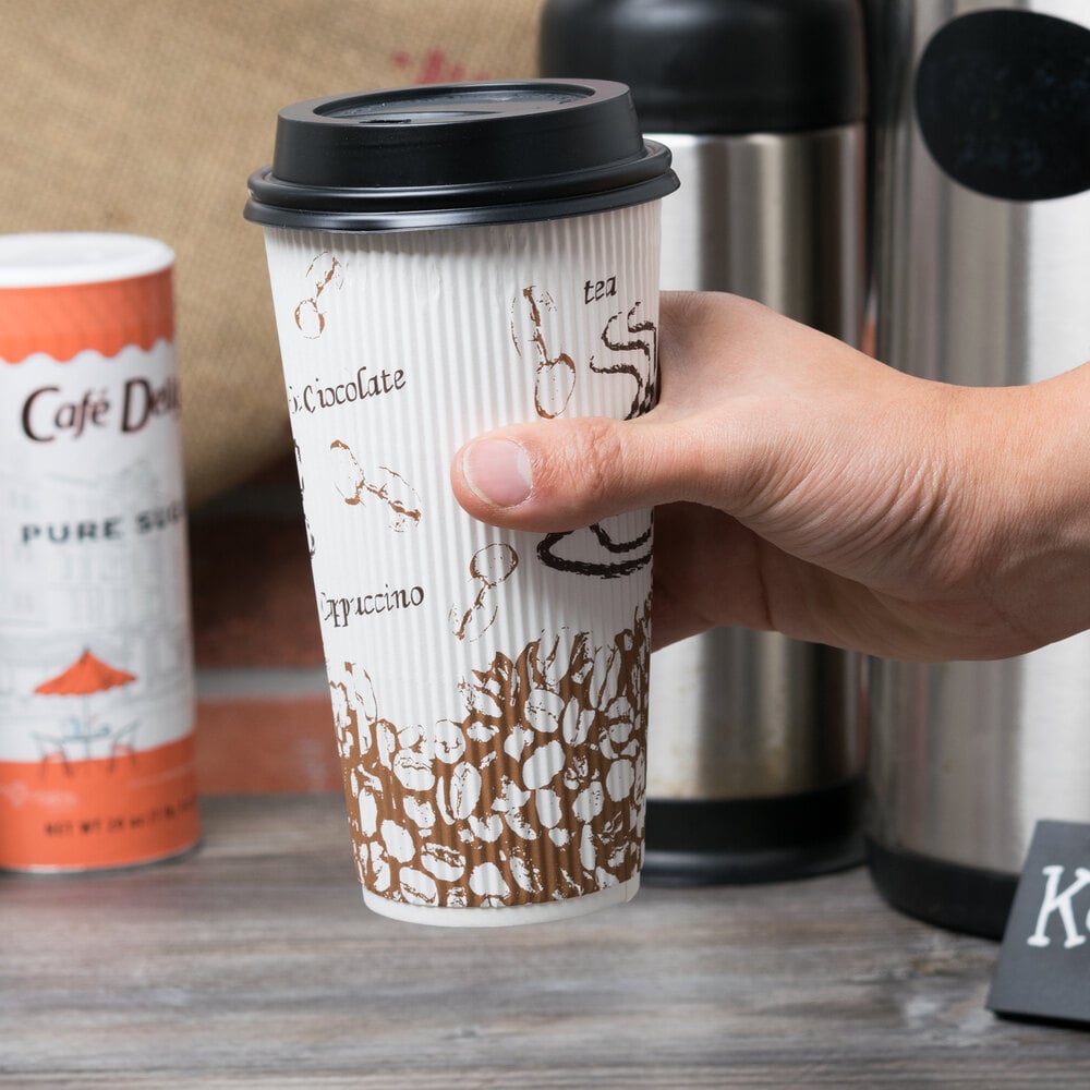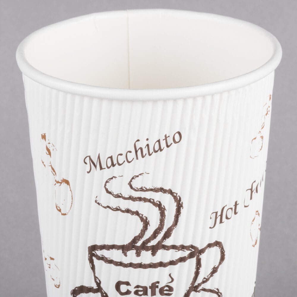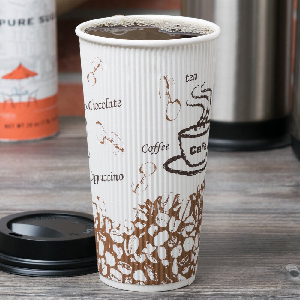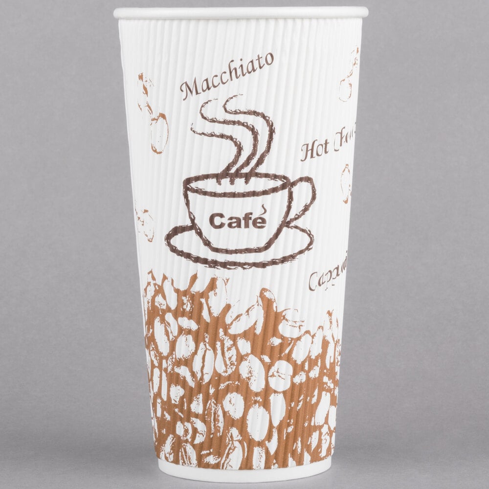 This Choice 20 oz. double wall bean print paper hot coffee cup is perfect for your coffee shop, bistro, concession stand, or kiosk, minimizing waste, while ensuring efficiency. The innovative rippled wall on the outside of each cup keeps the surface warm to the touch, not hot like with comparable smooth surface cups. Use this cup to hold coffee, cappuccino, and piping hot lattes. This cup is the ideal way to serve hot beverages, to-go, to all of your customers!