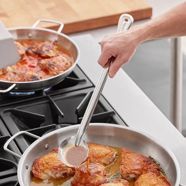Perfect for both stirring and serving, the versatility of this Choice 21" solid stainless steel basting spoon makes it an excellent addition to any kitchen. The durable, stainless steel construction means this spoon will hold up in even the busiest of kitchens.