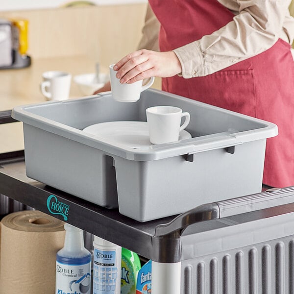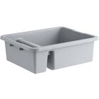 This versatile gray bus tub measures 21" x 17" x 7" and boasts a durable polypropylene construction built to carry even the heaviest of dinnerware. Ideal for use in busy bars, restaurants, or other foodservice establishments, this item allows you to easily transport supplies from your dining area to your dishwasher and anywhere in between.