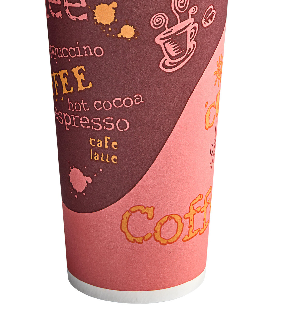 Both versatile and economical, this Choice hot coffee cup is the perfect beverage solution for your cafe, coffee shop, kiosk, concession stand, or convenience store. It features an attractive coffee design that provides a colorful alternative to plain white paper cups. Its space-saving construction allows it to be placed in a convenient cup dispenser for compact storage and easy accessibility. Plus, the convenient lid keeps drinks warm and protected as your guests take their coffee to go.