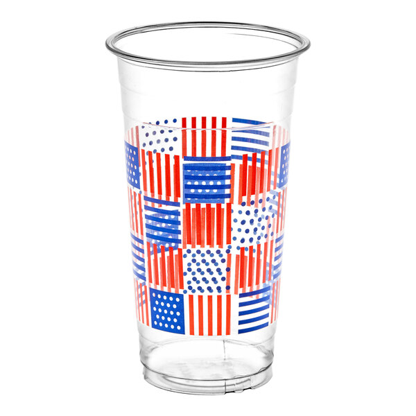 Add a fun and festive touch to your beverage service with this Choice 24 oz. patriotic print PET plastic cold cup! Featuring a crack-resistant PET plastic construction, this cold cup offers durability and reliable use. It boasts a brightly printed patriotic design that is perfect for summer festivities, and it can be paired with a compatible lid (sold separately) for secure transport. Ideal for fountain drinks, smoothies, and lemonade, this cold cup brings an upscale look and feel to your beverage presentation.