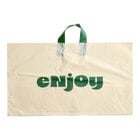 Streamline your takeout service with this Choice 24" x 11" x 14" standard-duty beige "thank you" plastic soft loop handle bag! This beige bag features a stylish green "thank you" print that adds a memorable touch to your customers' carryout experience. The design of the bag includes integrated soft loop handles and a flat bottom, making it the perfect solution for bagging orders on the go. With the ability to hold half size pans, this bag is ideal for accommodating catering orders, half size pans, and other large food orders.