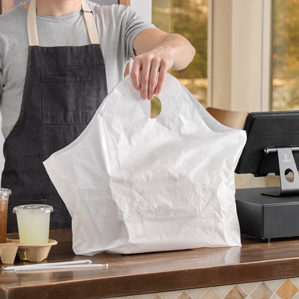 Streamline your takeout service with this Choice 24" x 11" x 20" standard-duty white unprinted plastic wavetop bag! This unprinted white bag will integrate seamlessly with your food packaging for a clean and professional presentation. The wavetop design of the bag includes integrated handles and a flat bottom, making it the perfect solution for bagging orders on the go. With the ability to hold half size pans, this bag is ideal for accommodating catering orders, half size pans, and other large food orders.