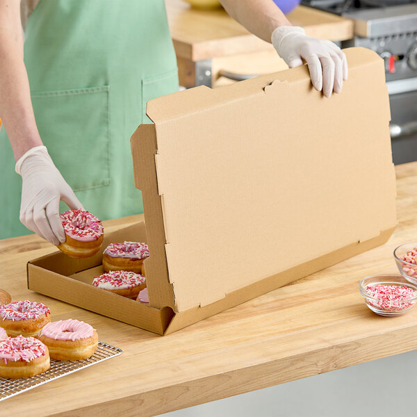 This kraft corrugated plain bakery box is a perfect addition to your restaurant or bakery, perfect for transporting cookies, desserts, and other bakery items. It features a durable B-flute corrugated construction, so you can trust that your box won't warp and your baked goods will stay warm.