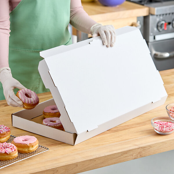 This white corrugated plain bakery box is a perfect addition to your restaurant or bakery, perfect for transporting cookies, desserts, and other bakery items. Alternatively, this box is great for transporting pizza, strombolis, and other pizzeria products. The plain white exterior provides space to add a custom stamp or logo for a pop of personalization.