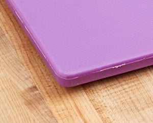 This cutting board can be used for cutting any items; however, it is important to adopt a color code system in your restaurant to prevent cross-contamination and to engage in food allergy management. Because this board is purple, it should ideally be used for items with special food preparation requirements, or allergen-free items. For example, you may designate this board solely for gluten-free or peanut-free preparation. Or perhaps you will use it to prepare vegan or vegetarian options.