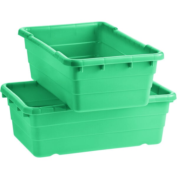 This item can even be integrated into a color-coded system, where different color boxes are designated for use with specific cuts of meat or other foodservice products. This ensures superior organization while reducing the risk of cross-contamination. This box's green color is commonly used for produce to help your chefs comply with the USDA's Hazard Analysis and Critical Control Point (HACCP) program. Plus, the container can cross stack or nest together with similar-sized tote boxes to help save valuable storage space.