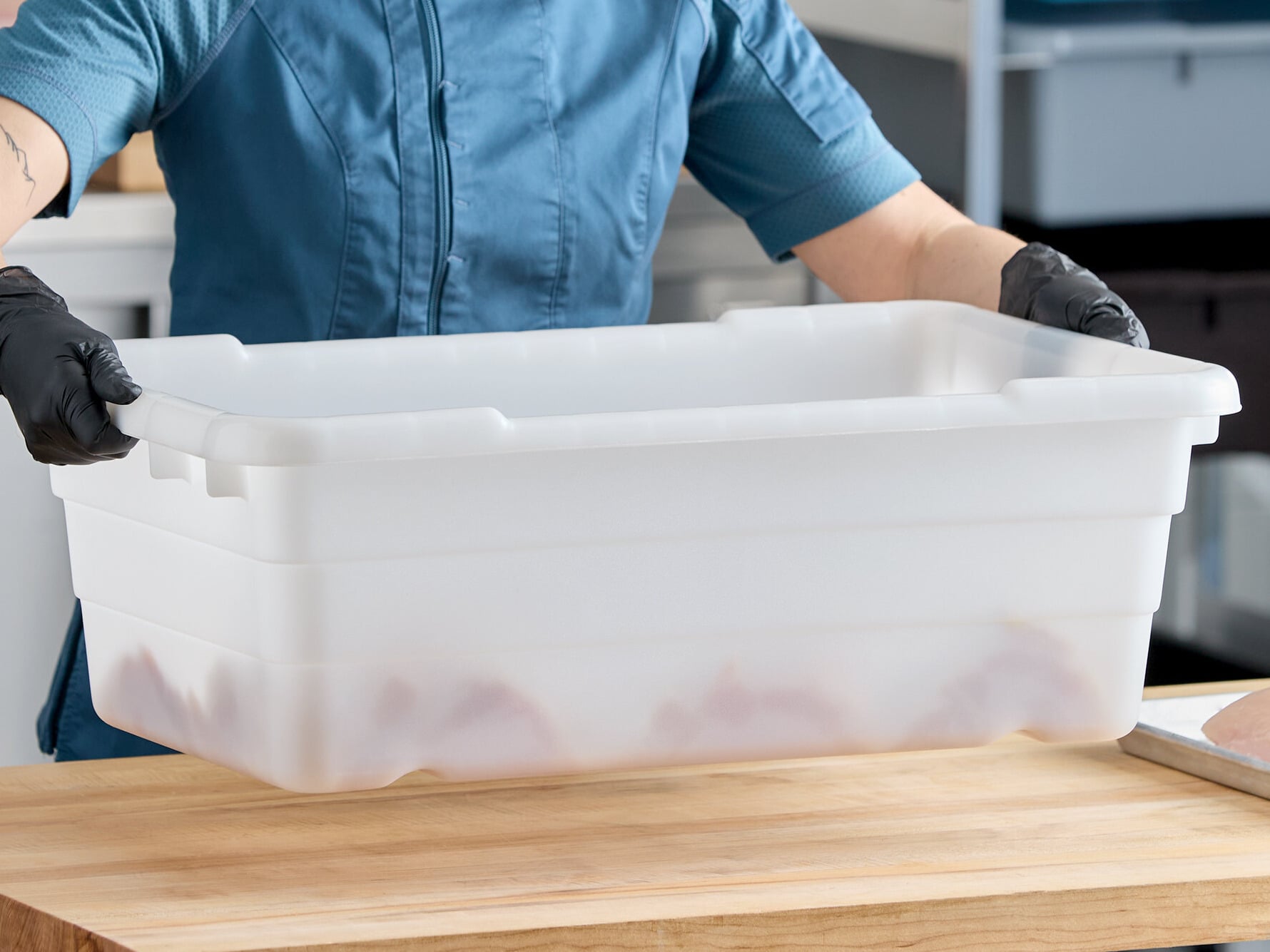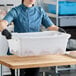 This item can even be integrated into a color-coded system, where different color boxes are designated for use with specific cuts of meat or other foodservice products. This ensures superior organization while reducing the risk of cross-contamination. Plus, the container can cross stack or nest together with similar-sized tote boxes to help save valuable storage space.