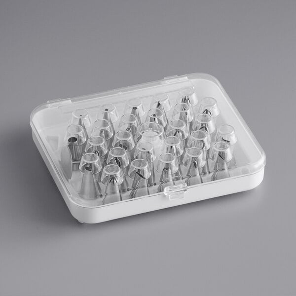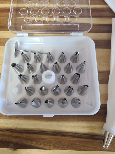 It comes with a hinged plastic box where your decorating tips will fit nice and snug.
