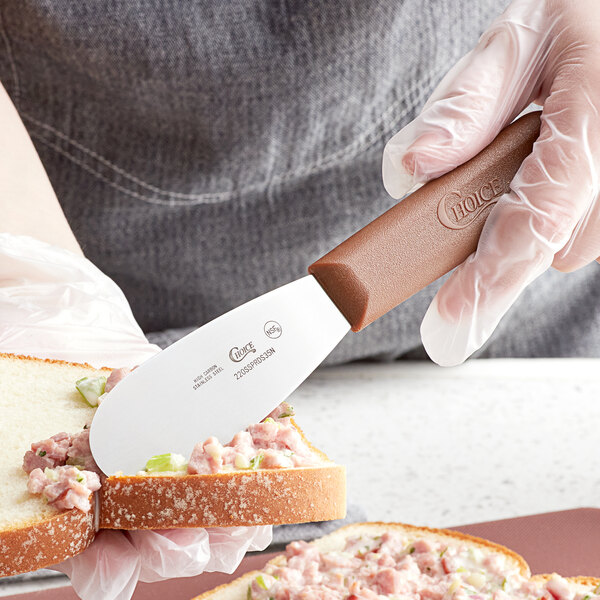 Featuring a wide, flat blade surface for great coverage and easy spreading, this spreader is perfect for preparing foods in school cafeterias, delis, cafes, and other high-volume operations. Use it to spread butter, jelly, mustard, mayonnaise, and ketchup. An extremely versatile kitchen tool, this spreader can do more than apply toppings, too - it can also be used to remove muffins and cupcakes from non-stick pans, trim frosting on cakes, or mix icing colors together.