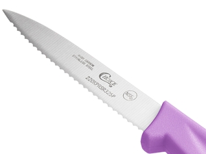 Long-lasting, light, and affordable, this versatile Choice paring knife is ideal for use in any high-volume commercial kitchen, as well as culinary schools and cafeterias. Great for preparing all manner of fruits and vegetables, the short blade allows for precise control while effortlessly peeling, slicing, and cutting. With this knife, creating a fresh vegetable stew or refreshing fruit salad is not only possible, but easy! Part of a convenient color-code HACCP line, this knife has a purple colored handle that allows it to stand out and makes it great for creating a color-coded system in your kitchen to prevent cross-contamination.