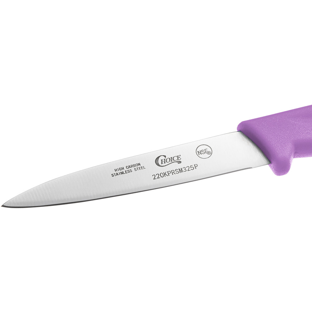Long-lasting, light, and affordable, this versatile Choice paring knife is ideal for use in any high-volume commercial kitchen, as well as culinary schools and cafeterias. Great for preparing all manner of fruits and vegetables, the short blade allows for precise control while effortlessly peeling, slicing, and cutting. With this knife, creating a fresh vegetable stew or refreshing fruit salad is not only possible, but easy! Part of a convenient color-code HACCP line, this knife has a purple colored handle that allows it to stand out and makes it great for creating a color-coded system in your kitchen to prevent cross-contamination.