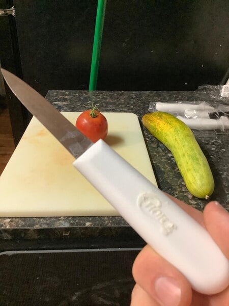 This knife is great for cutting up some veggies, fruit and so much more! It has a smooth cut and good grip, and I would definitely recommend it!