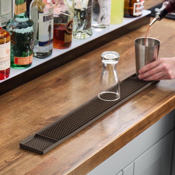 Perfect for lining the serving rail of a bar, this Choice 3 1/4" x 27" one-piece bar mat is a great addition to your bar, cafe, restaurant, or pub! Made of non-skid thermoplastic rubber, this durable bar mat keeps your glassware secure on the bar's serving rail. The mat works to decrease potential chipping of your drinkware and reduce the amount of accidental breakage in the fast-paced environment of your busy venue.