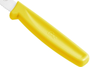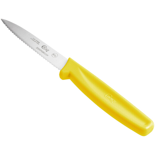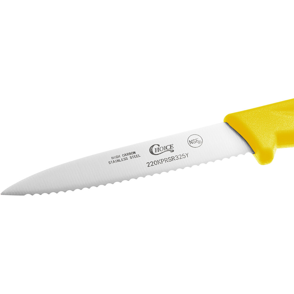 Long-lasting, light, and affordable, this versatile Choice paring knife is ideal for use in any high-volume commercial kitchen, as well as culinary schools and cafeterias. Great for preparing all manner of fruits and vegetables, the short blade allows for precise control while effortlessly peeling, slicing, and cutting. With this knife, creating a fresh vegetable stew or refreshing fruit salad is not only possible, but easy! Part of a convenient color-code HACCP line, this knife has a yellow colored handle that allows it to stand out and makes it great for creating a color-coded system in your kitchen to prevent cross-contamination.