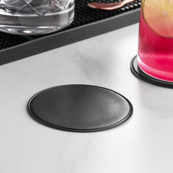 This coaster is made from soft, expanded vinyl with heat-sealed edges for a dependable design. It boasts a feel that customers will love and the sophisticated black color provides the perfect backdrop for a variety of glassware styles.