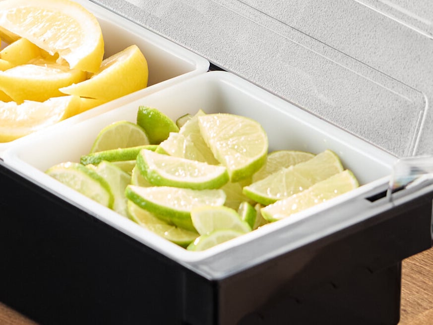 This works great. We fill the bottom with ice and change it through out the shift to keep the fruit cold. At the end of the night we store the whole unit in the cooler.