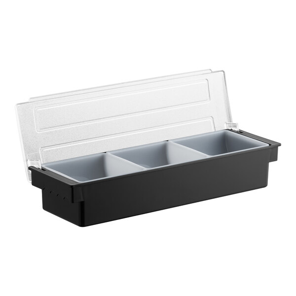 This black container features a flip-top lid made of white, translucent plastic. This allows the condiments to stay partially visible when covered for quick reference. When closed, the lid helps prevent cross-contamination and protects the food from air-borne contaminants.