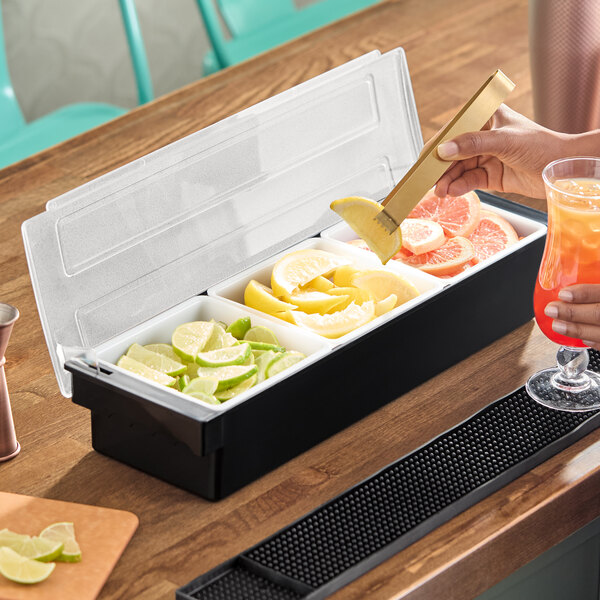 This Choice 3-Compartment Condiment Bar was a great addition to our bar at the party. The clear tray cover that's attached covered our limes, cherries and oranges well. The white trays lifts out with ease for clean up. We have also used this for taco night to put the cheese, salsa and tomatoes in.
