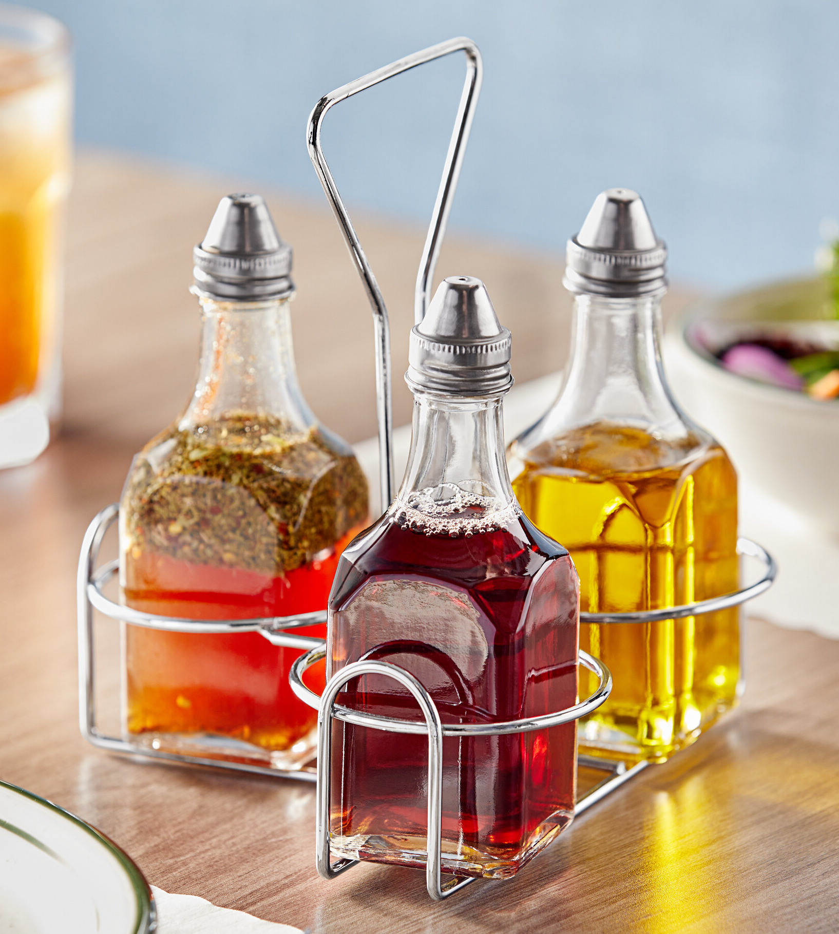 This holder and cruets are at home on either a condiment table at a burger stand to allow customers the chance to spice up their own fries or on the table at an upscale restaurant serving gourmet salads and dressings. You can use the attractive cruets to provide garlic-infused oil for dipping breads, house-made dressing for salads, or vinegar for crispy fries.