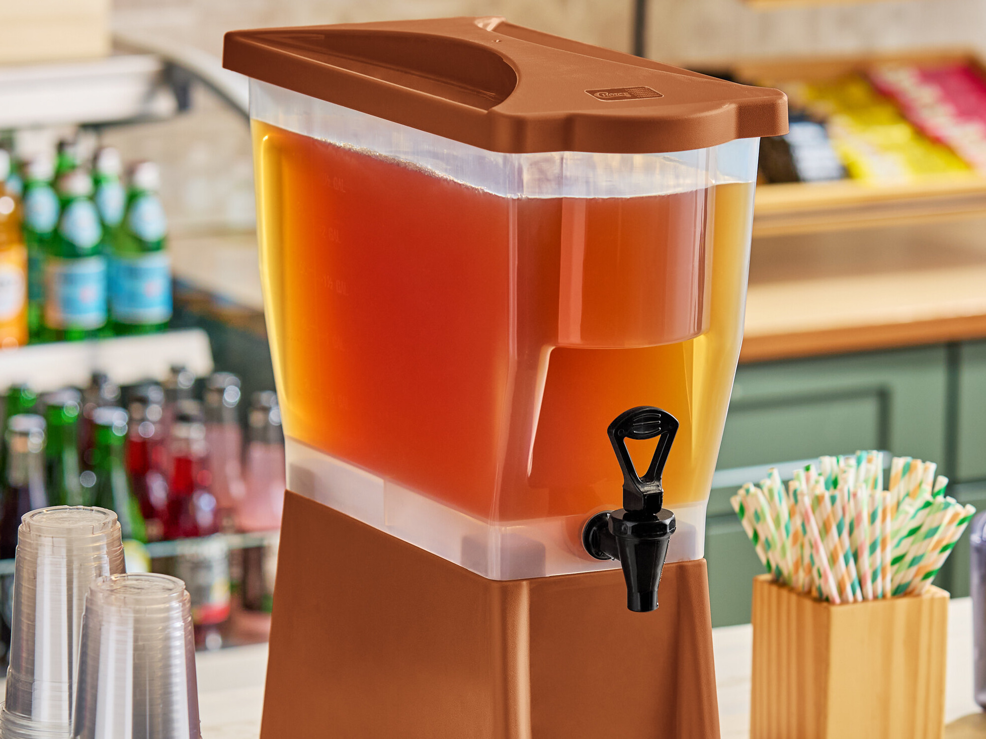 This Choice brown slim beverage dispenser combines eye-catching style with superior service, making it perfect for serving refreshing beverages at your outdoor eatery or casual catered event! With a generous 3 gallon capacity, this beverage dispenser will minimize the time spent refilling, thus allowing your staff to focus on other important tasks. Simply place it at your beverage station, fill it, and let your customers enjoy your signature iced tea, punch, or lemonade!