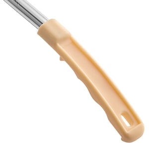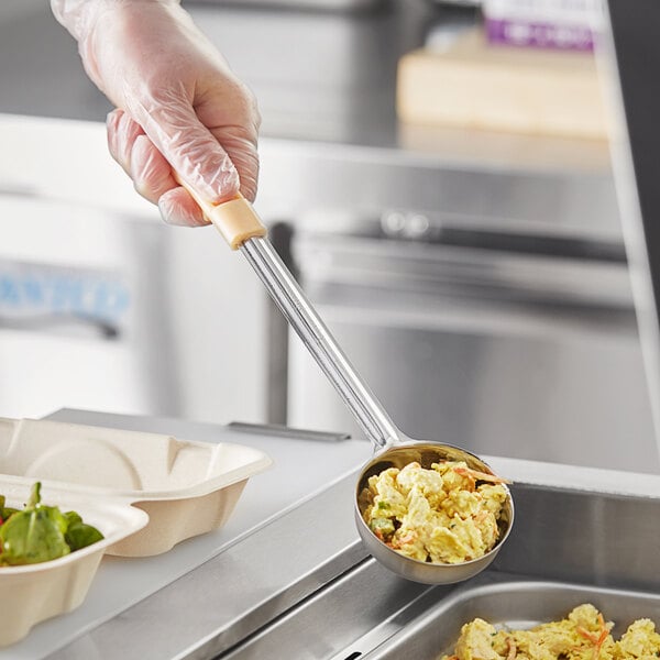 Details like the ivory handle and stamped capacity number make it quick and easy to identify this portion spoon from others. A built-in stopper notch prevents the handle from sliding into food pans.