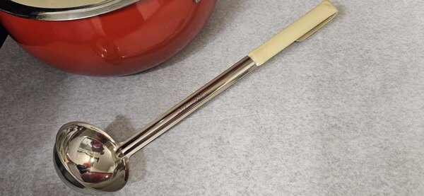 Nice coated handle soup ladle. Handle doe not get hot and long enough to get to bottom of our soup pots. Used for our every day special, weather its chili or tomato soup.