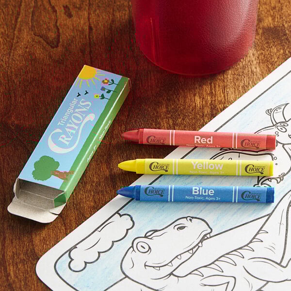 Choice 3 pack triangular kids' restaurant crayons are perfect for keeping diners both young and old happy! Each pack comes with three crayons, one each of red, yellow, and green. The fun, colorful box is perfect for storage, and the crayons are non-toxic for safe usage by children. Plus, the triangular design of the crayons prevents them from rolling off the table. Each case comes with 500 packs of crayons, ensuring that you will have plenty to go around even during the busiest of dinner rushes.