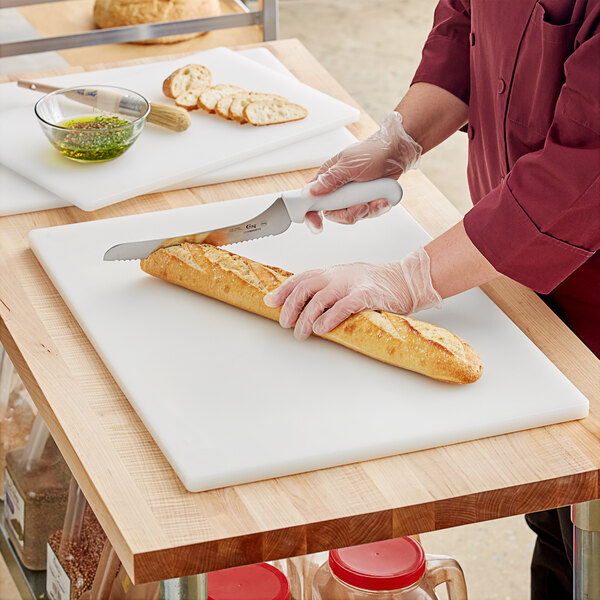This cutting board kit can be used for cutting any items; however, it is important to adapt a color code system in your restaurant to prevent cross-contamination and to engage in food allergy management. Because these boards are white, they should ideally be used for bakery items. Slice anything from fresh baguettes and bagels to muffins or cakes.