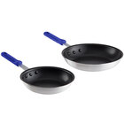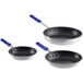 Ideal for making low acidic foods such as mushrooms, broccoli, and cauliflower, this item features gently sloped sides that are perfect for turning, flipping, and removing delicious vegetable medleys from your pan. Its aluminum construction is also built for dependable use yet provides your kitchen with a lightweight, economical option that won't break the budget. Plus, its PTFE non-stick coating offers advanced release properties for healthier cooking and easier cleanup, while its blue silicone handles supply a comfortable grip that's heat-resistant up to 450 degrees Fahrenheit! This versatile set includes (1) 8", (1) 10", and (1) 12" frying pan to satisfy all of your cooking needs.