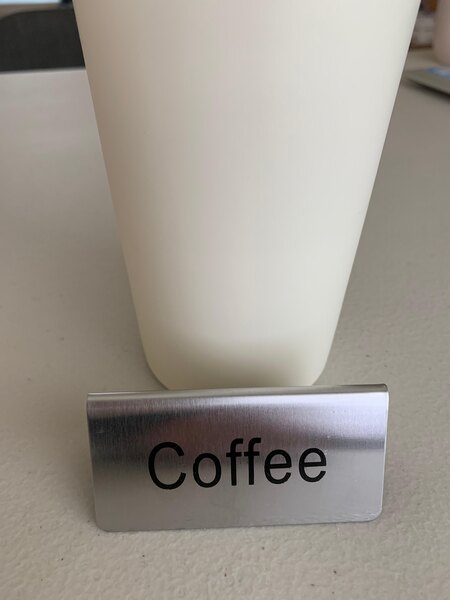"Great stainless steel sign. Perfect size for a coffee station. Letters are high contrast and easily readable. fingerprints are kept to a minimum with the finish"