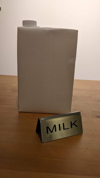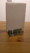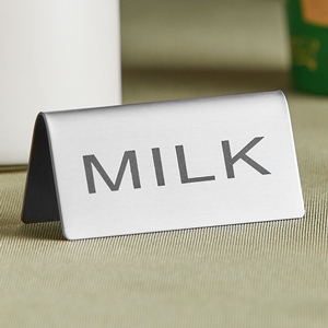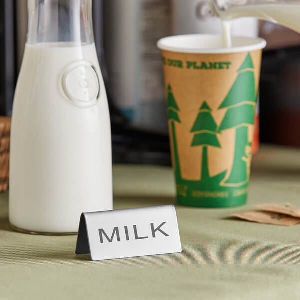 The striking "milk" print featured on both sides of this sign is easy to read, ensuring that it visible from multiple angles for anyone that visits your beverage station. Its design and size make the sign easy to display without taking up too much space, saving room for other necessities like sugar packets and creamers.