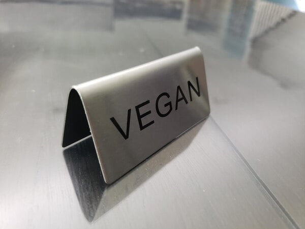 With text that reads "vegan," you can easily label alternative-diet options for customers and guests. Thanks to the double-sided printing, the message can be viewed by guests no matter where they are standing or sitting.